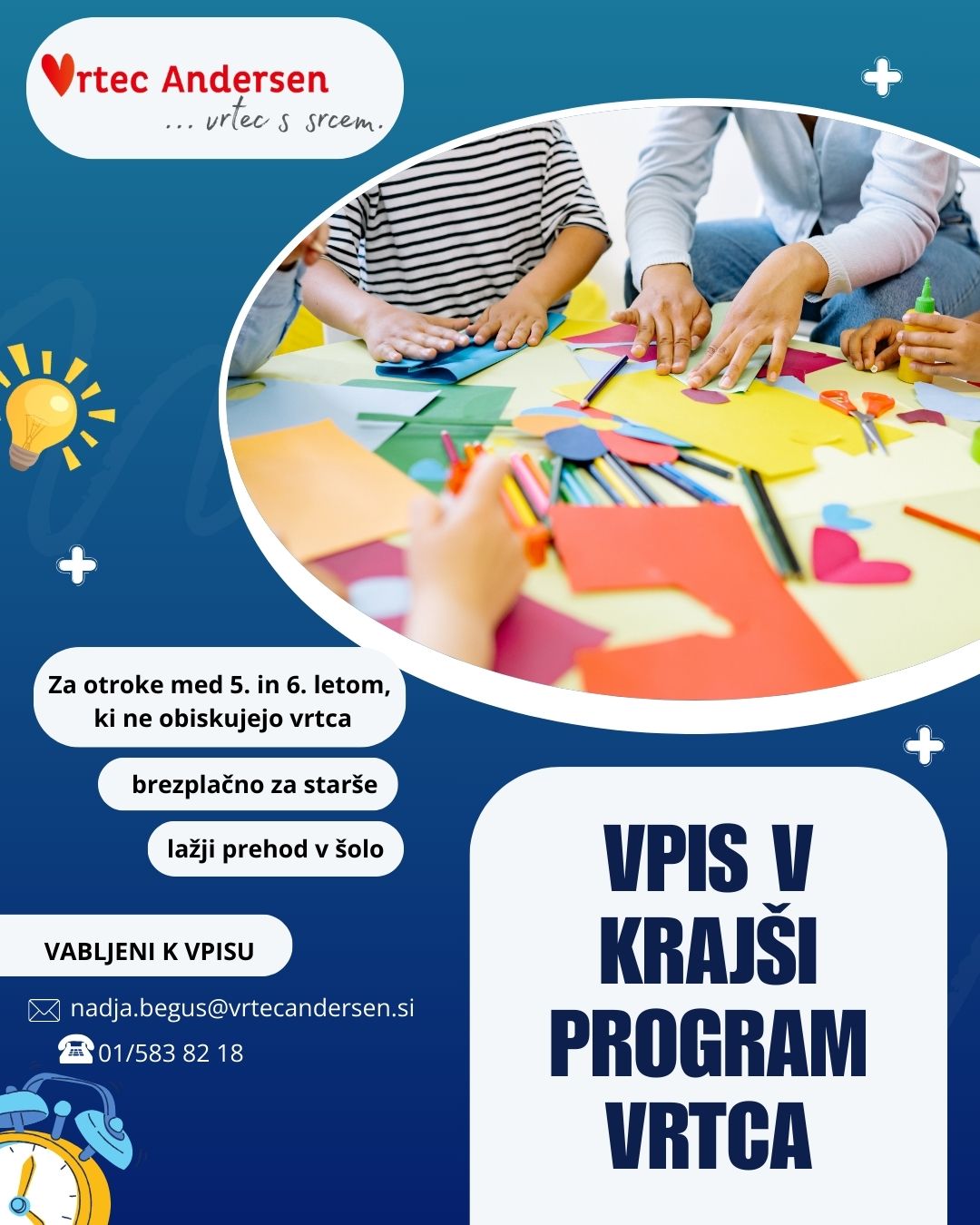 Krajši program je namenjen otrokom med 5. in 6. letom starosti, ki bodo s 1. septembrom 2026 vstopili v prvi razred osnovne šole in še ne obiskujejo vrtca. Program bo potekal v prostorih vrtca Andersen, v popoldanskem času in je za vse starše povsem brezplačen.
